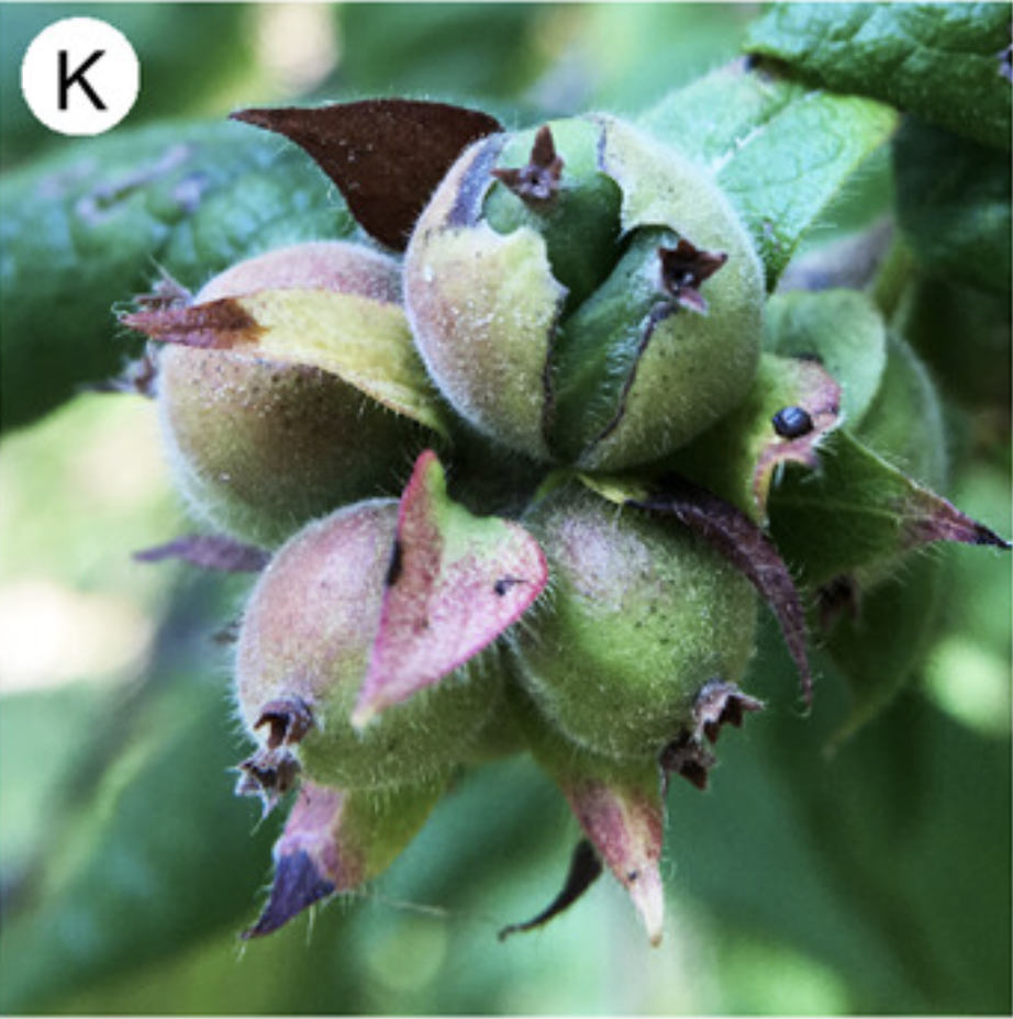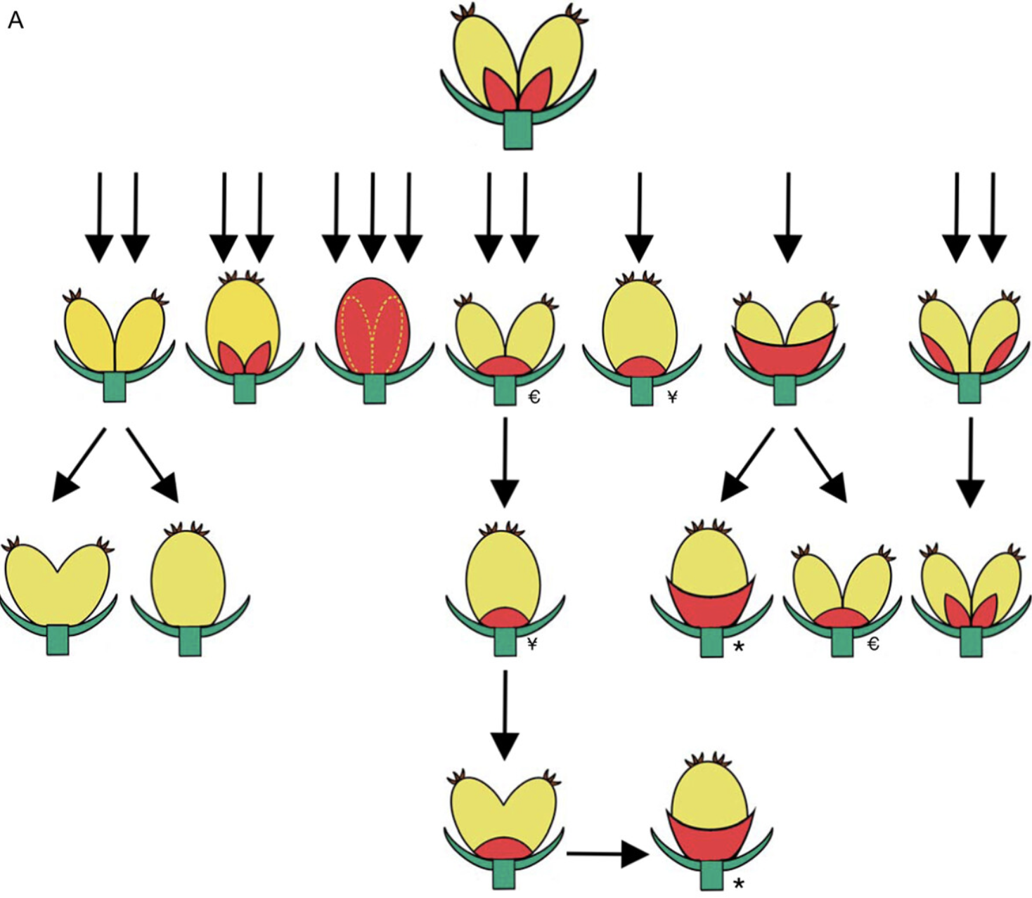 이 단계 이후 두 씨방의 유착 정도는 다양한 단계로 진화를 겪게 된다. 게다가, 서로 접한 두 꽃의 소포엽 4개도 서로 밀착하여 다양한 형태로 유착되었을 수 있다. 어떤 종은 4개의 소포엽 모두가 유착되어 두 씨방 밑부분은 작은 고깔(cupule) 모양으로 만들어진다. 이 고깔 모양이 자라나서 부분적 또는 온전하게 두 씨방을 감싸는 형태가 되기도 한다. 대부분의 경우 4개의 소포엽이 유착되어 두 씨방을 온전히 감쌀 경우 완전한 깍지가 형성되었다고 한다. 이 깍지가 자라나면 안에서 성장하던 씨방이 깍지를 부수고 나오거나(K) 그렇지 못할 경우 속에서 완전히 성숙하게 된다(J).