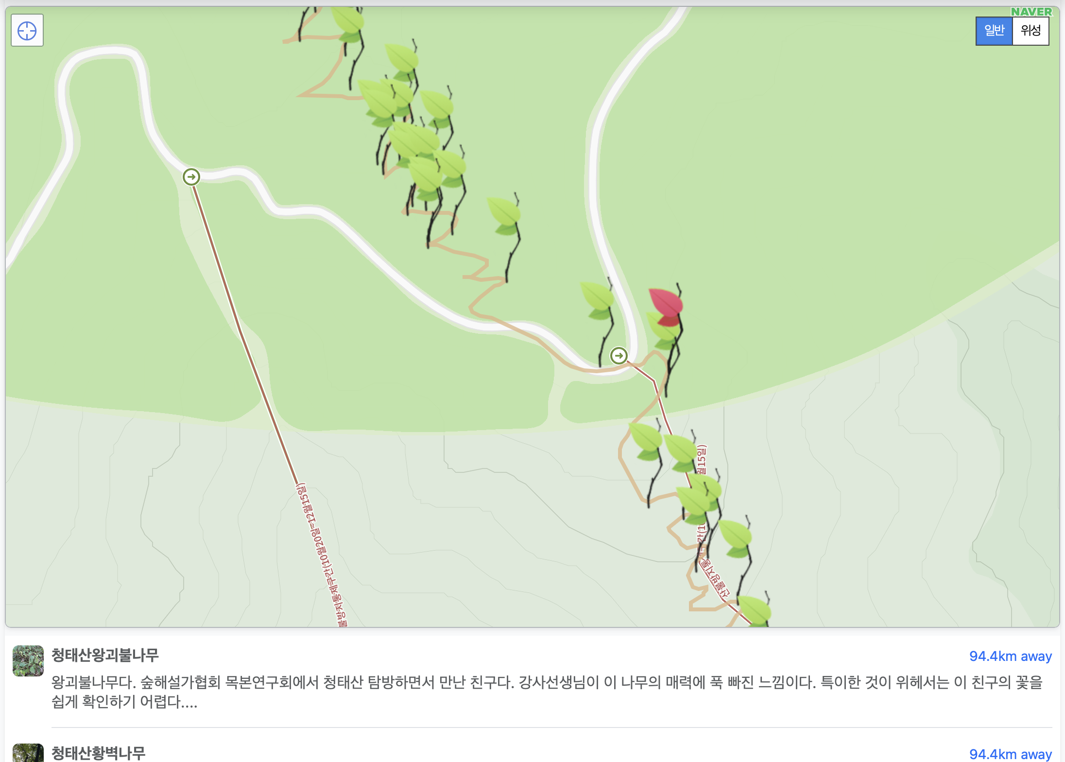 처음 만나고 일주일이 흐른 5월 중순(5.17)에 다시 찾았다. 아무리 생각해도 시간이 더 지나버리면 이 친구의 위치를 잊어버릴 것 같아서다. 그렇다고 매주 찾을 수는 없는 일. 그래서 이참에 청태산 나무지도를 만들면 좋겠다는 생각으로 희미해져 가는 기억을 더듬으며 목본연구회 탐방 때 기록해 둔 숲친구들을 하나하나 다시 꺼내 이들의 위치를 GPS로 기록했다. 아쉽게도 길게 이어진 데크길은 휴대폰 지도에 나오질 않아 다시 한번 더 같은 속도의 걸음으로 걸으면서 데크길의 경로 데이터도 만들어 냈다. 이런 일을 해온 나에게는 그리 어렵지 않은 터라 수집한 데이터를 집으로 가져온 후 컴퓨터 프로그래밍으로 데크길과 나무지도를 완성했다.