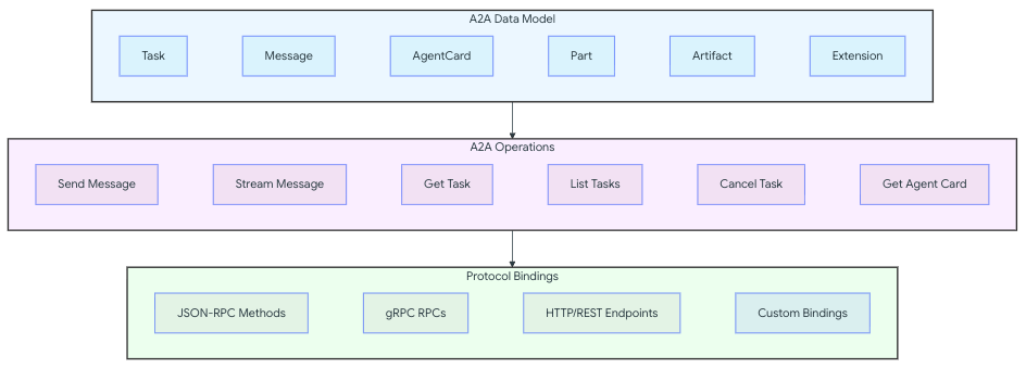 Layer 1: Canonical Data Model defines the core data structures and message formats that all A2A implementations must understand. These are protocol agnostic definitions expressed as Protocol Buffer messages.