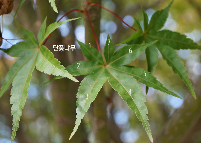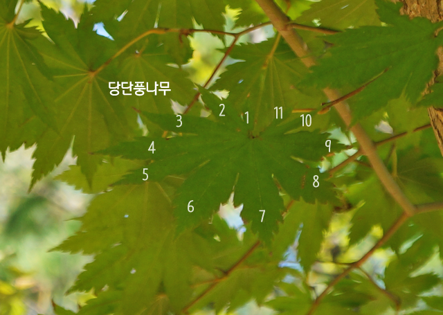 개로 갈라져 있고, 잎이 조금 통통한 느낌이다. 단풍나무 잎은 당단풍나무 잎에 비해 조금 더 날렵하게 생겼다. 당단풍나무의 잎은 다른 나뭇잎보다 붉고 선명하게 물든다. 그렇다 보니 당단풍나무가 많은 내장산이 단풍 명소로 손꼽힌다.