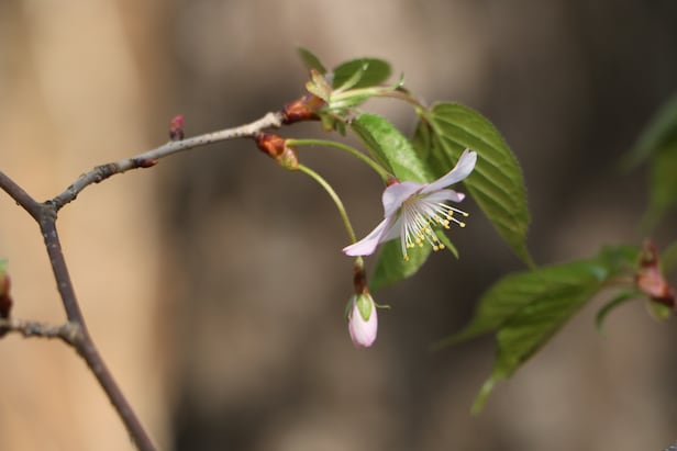 벚나무, 산벚나무, 잔털벚나무는 꽃이 필 때 잎도 보입니다(왕벚나무도 꽃이 질 즈음 잎이 나오니 꽃이 막 필 때 기준입니다). 주로 산에서 볼 수 있는데 어쩌다 공원이나 가로수로도 한두 그루 심어놓은 것도 볼 수 있습니다. 그러니까 산이나 거리에서 벚꽃이 피었는데 잎도 같이 보이면 벚나무, 산벚나무, 잔털벚나무 중 하나일 것입니다. 벚나무와 산벚나무는 작은꽃자루(꽃자루에서 나온 작은 꽃자루)와 잎자루에 털이 없어서 깔끔합니다. 벚나무와 산벚나무 차이는 작은꽃자루가 꽃자루에서 나오느냐, 줄기에서 나오느냐 차이입니다. 벚나무는 꽃자루가 있고 산벚나무는 꽃자루가 없습니다. 그러니까 줄기에서 꽃자루가 나오고 이 꽃자루에서 작은꽃자루가 나와 꽃이 피면 벚나무, 작은꽃자루가 줄기에서 바로 나오면 산벚나무입니다. 벚꽃보다 좀 늦게, 벚꽃이 여러 장 겹쳐 피는 겹벚나무도 볼 수 있는데, 이 나무는 산벚나무를 육종해서 만든 품종이라고 합니다.